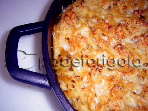Amb el mateix oli de rostir el pollastre hi fem un sofregit amb la ceba tallada ben petita, els grans d’all també tallats petits i el tomàquet ratllat (per evitar l’acidesa del tomàquet podem tirar-hi una mica de sucre), hi tirem sal i el pebre vermell dolç, tot pas a pas i poc a poc. Tot seguit hi incorporem el pollastre i per últim els macarrons. Deixem que cogui cinc minuts tot junt, passats aquests cinc minuts hi tirem una part del formatge ratllat i el remenem perquè quedi incorporat amb la resta, finalment el formatge que ha quedat el tirem per sobre, parem el foc hi tapem la cassola perquè es fongui. Si ens agraden ben rossos podem posar-los al forn a gratinar.