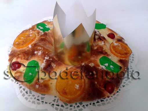 Passat aquest temps estirem la bola amb un corró fent un rectangle de uns 80×20 cm. hi escampem la crema a un cantó de cap a cap, hi posem el rei i la fava i el cargolem, tot seguit li donem forma de tortell sobreposant les puntes i el col·loquem sobre la llauna del forn coberta amb paper vegetal, el guarnim amb fruita confitada i el deixem reposar a dins el forn, perquè no li toqui l’aire, mínim dues hores perquè creixi, recomano posar un got cap per avall al mig perquè no es tapi el forat. Passat aquest temps, pintem el tortell amb ou batut i li tirem sucre bolat per sobre, per fer-lo humitegeu un bol amb aigua, hi tireu sucre i amb els dits el remeneu perquè quedi agrumollat.