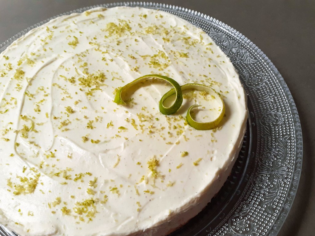 160gr galetes Maria • 80 gr. de mantega • 600g formatge tipus Filadèlfia • 300 gr de xocolata blanca • 200cc de nata per muntar (35%MG) • 1 cullerada sopera de sucre • 1 culleradeta de vainilla • 2 llimes grans • motlle desmuntable de 24cm de diàmetre
