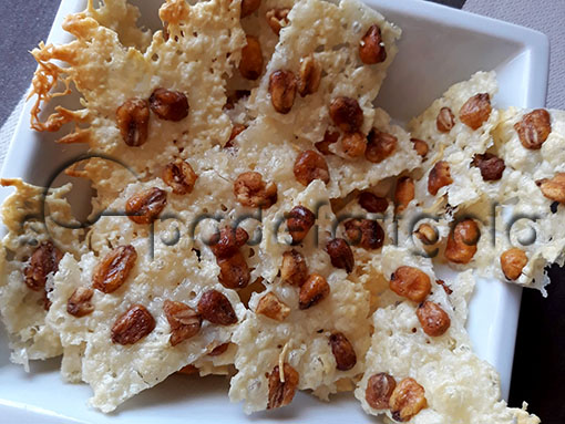 En una safata de forn hi posem paper vegetal i hi escampem el formatge ratllat, que quedi pla. Hi repartim els kikos i ho posem al forn, a mitja alçada, amb el grill fins que el formatge quedi torrat. Ho trèiem i quan està fred en fem trossos de la mida de xips, trencant-los amb les mans, si no es trenquen bé ho fem amb l’ajuda d’unes tisores.