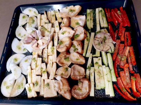 Agafem una safata apte pel forn i untem el cul amb una mica d’oli. Tallem les verdures i hortalisses del mateix gruix, els bolets sencers i la cabeça d’alls partida en dues meitats. Ho anem col·locant a la safata (Ho podeu veure a la foto de sota). Fem una salsa verda (4 grans d’all, julivert i oli, tot triturat amb la batedora) i l’escampem per sobre les verdures, ho salpebrem una mica, hi tirem una mica més d’oli i, per últim, hi escampem el pa ratllat.