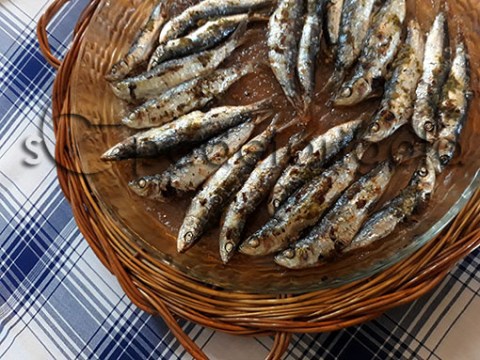 1 kg. de sardines • oli d’oliva •1 cabeça d’alls •1 got de vinagre • 1 got d’aigua • 1 cullerada sopera de pebre vermell • una mica de pebre negre • sal • 2 fulles de llorer
