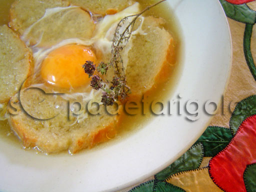 2 cebes • 1,5 l. d’aigua • 12 llesquetes de pa torrat ben primes • 4 ous • 150 gr. de formatge ratllat • oli d’oliva • sal