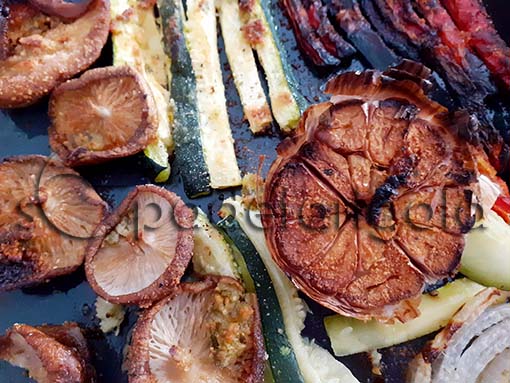 1pebrot vermell • 1 albergínia • 1 carbassó • 10 o 12 bolets frescos (xampinyons, xiitaques, gírgoles…) • 1 ceba • 1 cabeça d’alls • pa ratllat • julivert • oli d’oliva • sal • pebre negre