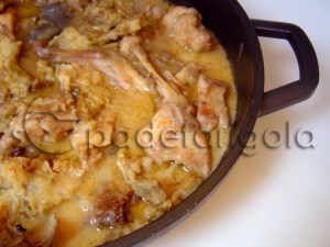 1 conill • 3 escarxofes • oli d’oliva • llard • 1 ceba grossa • 2 tomàquets • 4 grans d’all • ½ canó de canyella • brandi • farina