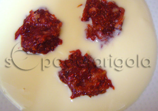 Fondre la xocolata blanca al microones en un bol (1,5 minuts aprox.), a mitja cocció remenar-la perquè de seguida es crema.