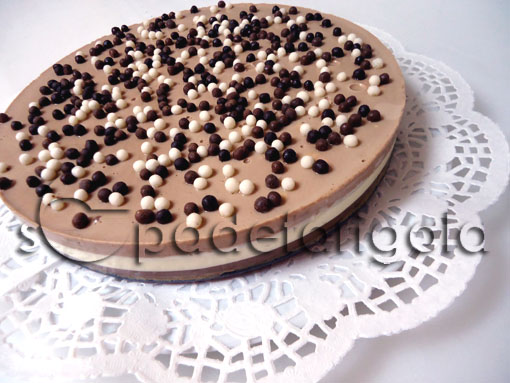 1 paquet de galetes Maria • 50 gr. de mantega • 150 gr. de xocolata negra • 150 gr. de xocolata amb llet • 150 gr. de xocolata blanca • 3 sobres de quallada Royal o similar • 750cc de llet • 600cc de nata per muntar (3 briks de 200cc) • motlle desmuntable de 26cm o menys de diàmetre